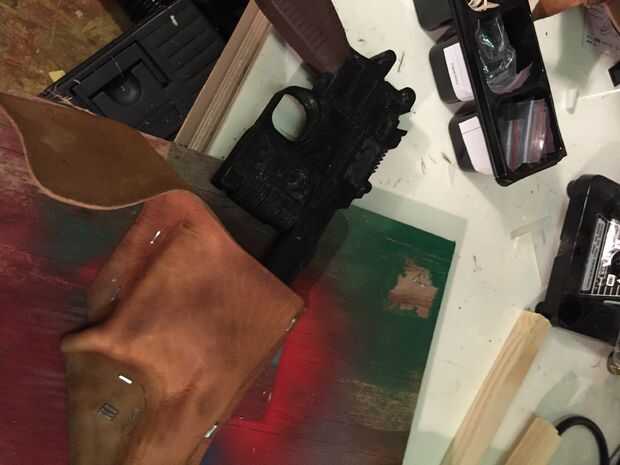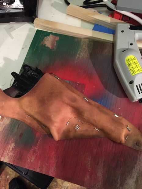 Una vez mojado, moldear el cuero con las manos alrededor de la forma de la pistola. Lo hice en un pedazo de madera contrachapada. Luego utilicé una pistola de grapas a las curvas de la clavija moldeada en los lugares que envuelven alrededor de una esquina. Esto pone el cuero a la junta con la pistola debajo. Lo dejé secar durante la noche. La piel recuerda la forma y ahora tenía la parte básica de la funda.