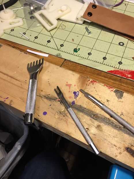 Tomé otro pedazo de cuero y trazada alrededor de la parte frontal de la funda. Realiza un seguimiento de la curvatura frontal pero el apoyo sigue siendo plano. Luego utilizo aplausos para inicialmente unir ambas piezas mientras que usaba un agujeros de golpe a golpe de cuero a través de cada sección. Según los diseños y fotos en línea, la funda de costura envuelve alrededor del exterior de la funda en cada punto. Así que había perforado los agujeros cerca de los bordes.