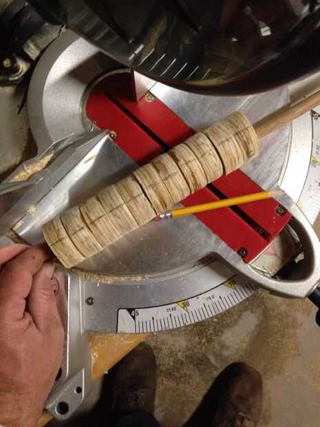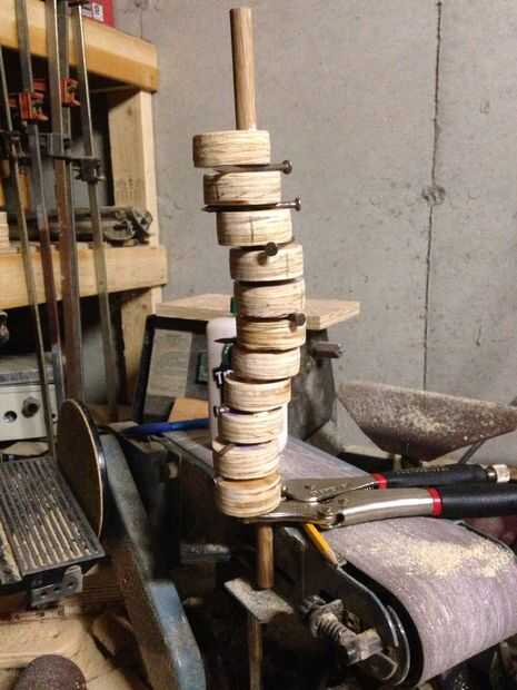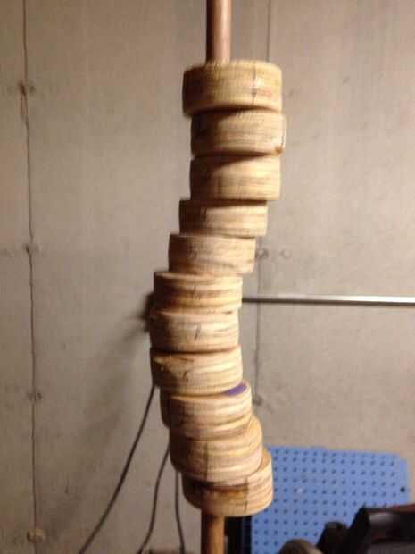 Poniendo en el eje sería más fácil de lo que esperaba. Después de poner todas mis piezas en el eje fila recta entonces una línea recta en los círculos para dar un punto de referencia. Luego se volvió cada uno unos treinta grados pasado el bloque anterior. Y puse un clavo de albañilería de 10 centavo en medio de un espaciador.