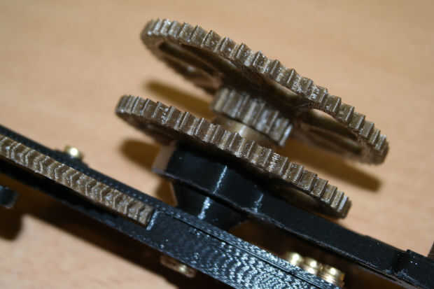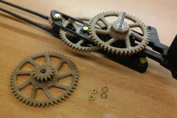 • Montar una tuerca M3 en el engranaje del minuto. Luego coloque una arandela sobre el eje de la M3 y atornille la tuerca de engranaje primero en el eje de M3. Mover hasta que la tuerca toque la lavadora, pero no apriete. Montar una arandela y una tuerca en el eje de la M3. Apriete la tuerca mientras sostiene el engranaje. Mover que ambos engranajes a mano para asegurar su correcto funcionamiento.