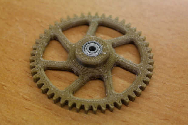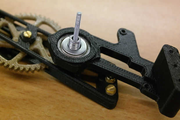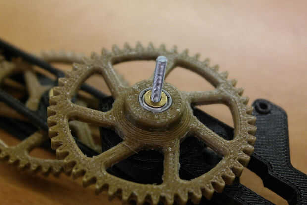 • Coloque el eje de la M8 de la Asamblea de la mano a través de la 608 cojinete. Coloque la arandela M8 y luego atornille el engranaje a la misma. Apriete el engranaje, pero tenga cuidado de no ejercer demasiada fuerza.