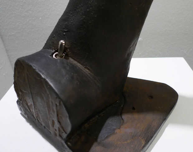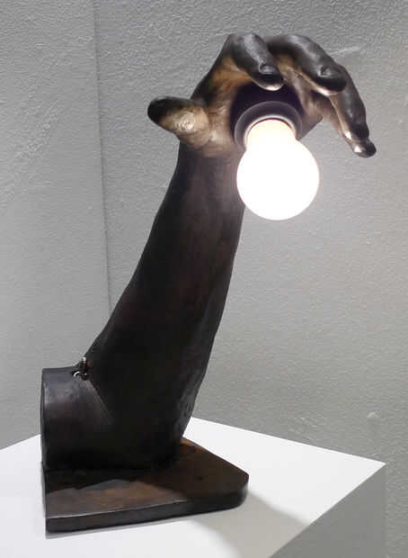 Se trata de una lámpara de mano de hierro fundido. El brazo empezó como una cera positiva de un bastidor de vida hecho en vendaje de alginato y yeso. Desde allí se cortó un agujero en el centro de la palma (de lo positivo de la cera) para permitir la toma de la bombilla que se metieran en lo que será el escenario final en el metal. Un agujero más pequeño se corta para permitir que el interruptor al pop a través de en la articulación del codo. Mediante el proceso de fundición de cera perdida, se quema la cera positivo fuera de una cáscara cerámica de alta temperatura y me quedo con un hueco de la negativa de mi brazo de cera original. A continuación añadir el hierro fundido y sentarse. Una vez fría, el producto de hierro crudo es astillado de su cáscara cerámica, perseguido con archivos y molinos y finalmente tratado con una combinación de un acabado al aceite y Nitrato férrico para herrumbre estética. -Para cualquier tipo de necesidad de hierro fundido, en contacto con el cuerpo de hierro de MassArt!