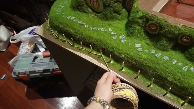 La valla está hecha de papel laminado. Encolar la primera parte hacia el final de la valla para mantenerlo oculto y luego la había tejida a través de los palos.