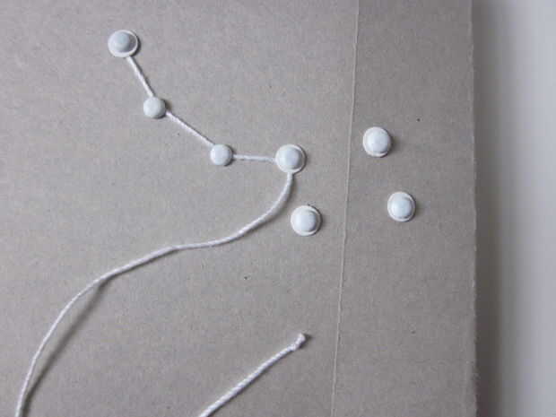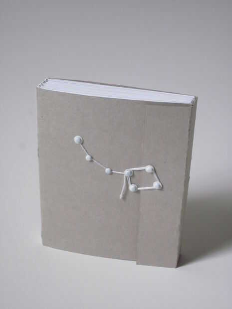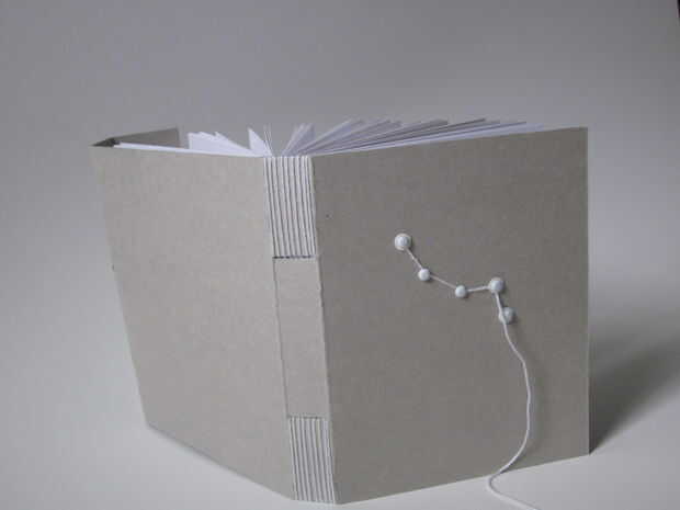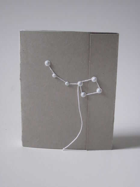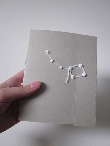 Yo quería mi portada que un colgajo envolvente, y quería de alguna manera integrar el cierre y pestaña en una decoración para la cubierta. Estaba pensando en bordar una constelación en el frente, y luego golpear me...use parte de la constelación como un cierre de cadena! Asomó a los agujeros en la cubierta, bordado "mango" del carro menor y una larga cola de cadena a la izquierda. Las "estrellas" son broches miniatura; Pegué los círculos de papel por debajo de los que fueron parte del cierre de la cadena.