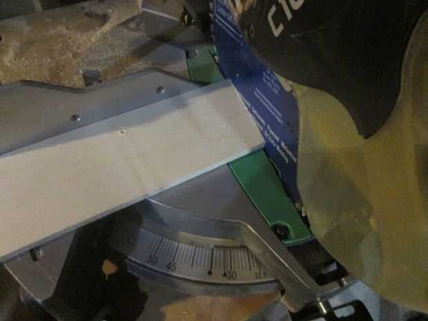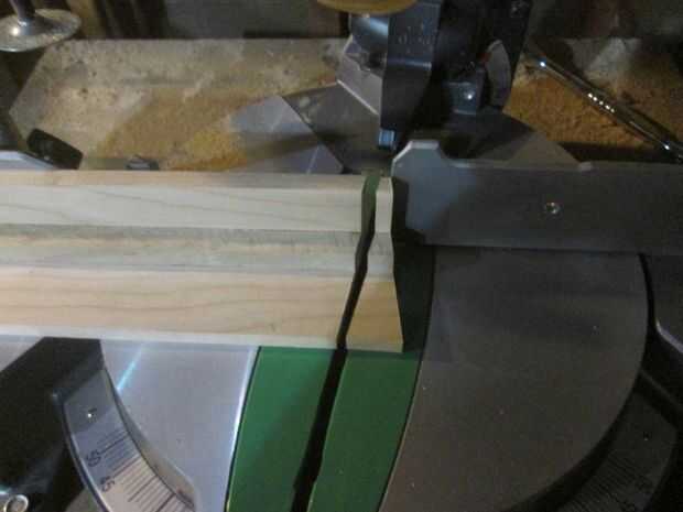 El primer corte en la guía deben ser con la hoja inclinada a la izquierda. Entonces incline la sierra hacia la derecha (usando mi sistema de guía para verificar el ángulo) y hacer otro corte. Salí cerca de 1.5" en el punto más ancho.