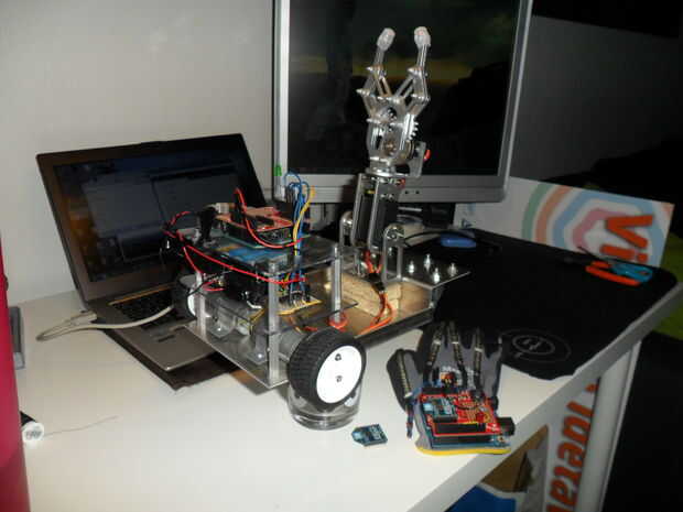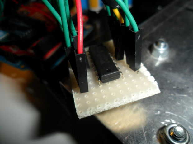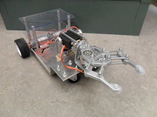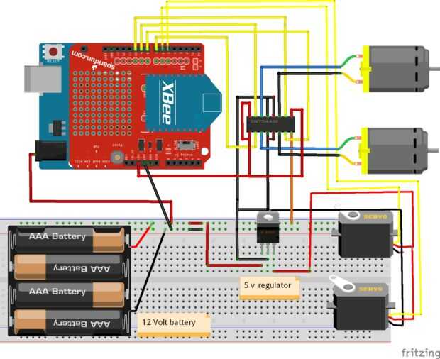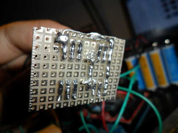 La alimentación en el robot tendrá una batería de 12v. Esto será tanto conducen el Arduino y los dos motores DC y servos, un regulador es necesario para bajar los 12 voltios de la batería de 5v que se requiere para los servos. El puente H, SN754410NE se suelda según el diagrama del circuito en una placa PCB regular. El interruptor se suelda y perfectamente a la batería.