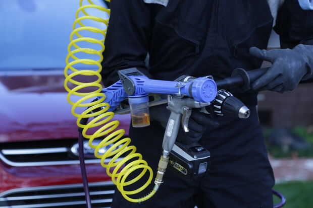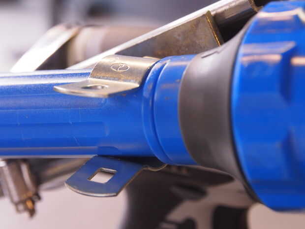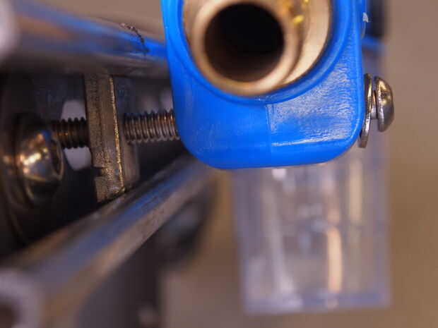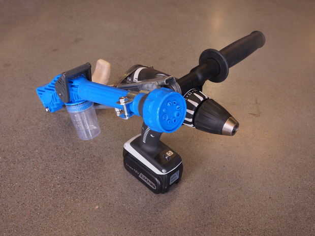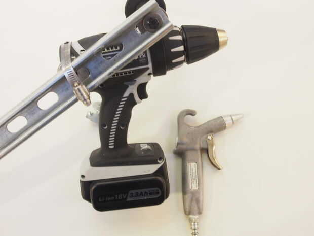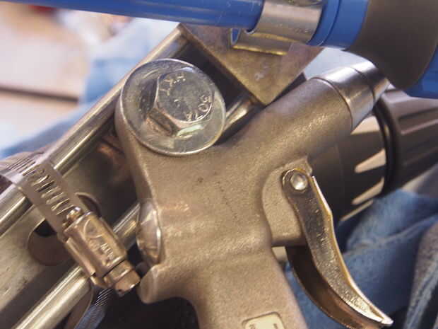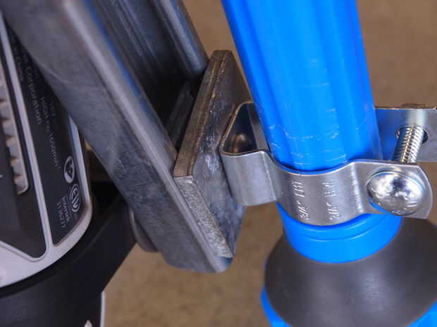 Nuestro cañón de agua y jabón tenía sin agujeros y un bonito cuerpo en frente redondo. Se monta con una pinza diseñada para conducto eléctrico ronda segura. Con cuidado perforé un agujero en el cañón para un 2" pulgadas 1/4"-20 tornillo en la parte posterior del cañón para mantenerlo estable.