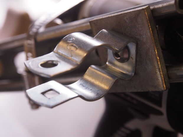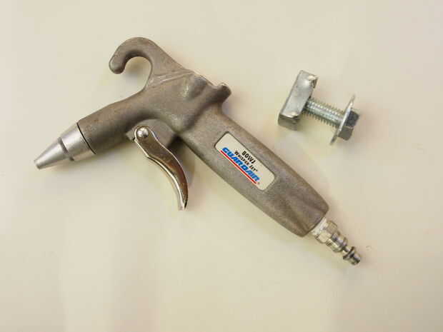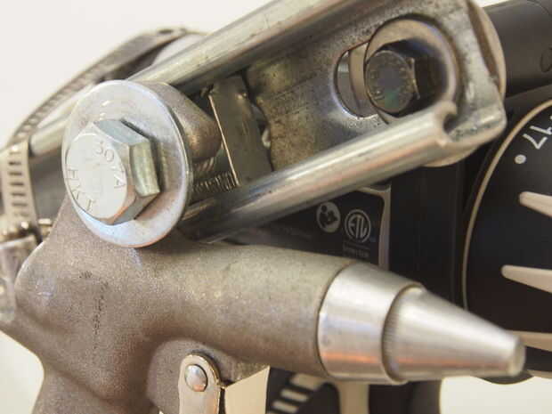 La pistola tiene un gancho en la parte superior que acepta perfectamente un perno de 1/2". Fue montado en el canal con una tuerca especial 1/2" Unistrut.