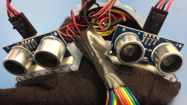 Sensor ultrasónico cose los dos soportes a la parte superior del guante, ahora bastante atrás por lo que no doblar con los dedos. Debe inclinarse ligeramente unos de otros por lo que su campo de visión es ensanchados (5-10 grados). Coloque cinta adhesiva de doble cara o algún otro adhesivo en el plástico entre las ranuras y fije los dos sensores ultrasónicos con sus pernos de energía y la comunicación hacia arriba y sus sensores audio hacia delante. Soldar los cables a los pines, o utilizar una solución menos permanente como lo (ver imagen).