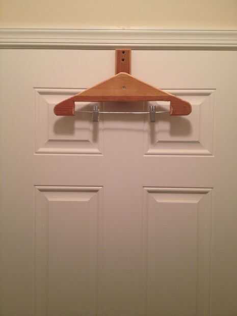 Cuando tenía la forma de un hangar de madera, corté la parte inferior de ella. A continuación, dos 1/8" los agujeros perforados en los lados. Esto hizo un lugar para la pieza de metal con los clips que rompí en el hangar de plástico.