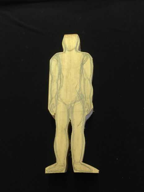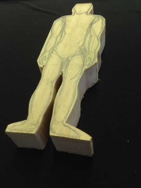 En primer lugar, mano dibuja la figura sobre el bloque o puede encontrar una figura en línea, imprimirlo y trazar o pegamento en el bloque. Lo hice con perfiles frontales y laterales de mi figura. Todo a siguiente, corte el exceso de material alrededor de su figura. Uso de que la Sierra de mesa para cortar el bloque a lo que se necesita. Esto te deja suficiente exceso de material para construir la horca más adelante. Por último recorte el material restante alrededor de la figura, teniendo cuidado de no llegar a cerca de sus líneas. Si usted tiene uno, una sierra de banda hace este trabajo mejor; de lo contrario su sierra de marquetería funcionará bien.