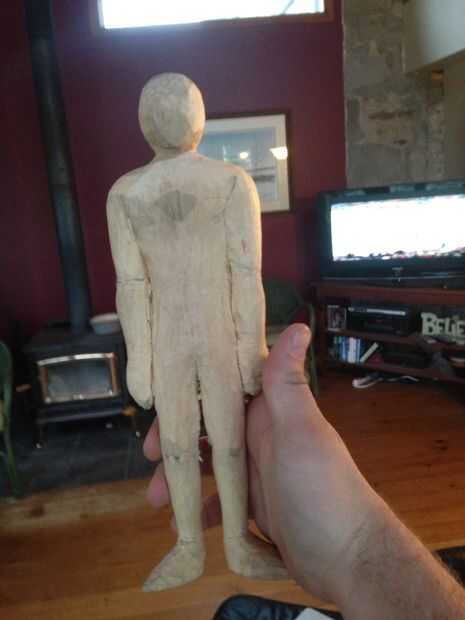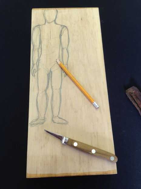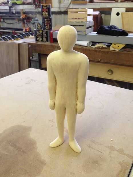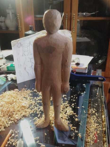 -Puesto que esto era nuevo para mí, decido empezar a tallar la forma de la figura enseguida (la redondez de las extremidades, la curva de los muslos) que significó que rápidamente tenía una figura con 2 extremidades gruesas como se desee, que yo entonces tallado a tamaño final. Estoy seguro que un buen tallador cómodamente podría tira lejos mucho más material rápidamente, tomando a cerca de tamaño final antes de que forma, pero esta forma trabajó bien ya que me permitió conseguir una sensación para el cuchillo y la madera, cometer errores y crear casi una figura de la práctica.