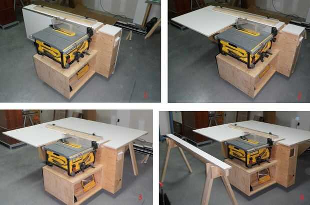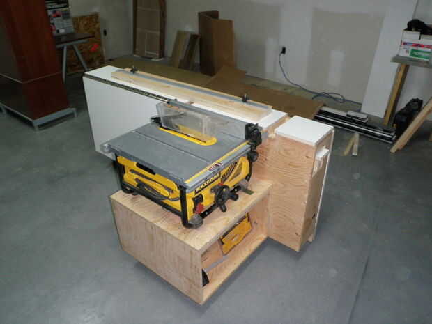 Hace unos años conseguí una mesa pequeña Hanon (DeWalt DW745, el modelo más viejo de lo que se muestra pero es casi la misma Sierra). Inmediatamente quería un soporte salido que me permitiera ripear una hoja completa de 4 x 8 de madera contrachapada si es necesario. Esta estación de trabajo me permite hacer eso, es fácilmente movible pero estable; cuenta con almacenamiento, pliegues hasta ocupar mucho espacio a lo largo de la pared y tiene un tope auxiliar. Es fácil de sacar la sierra si es necesario tomar un lugar, y si consigo una sierra diferente entonces la estación de trabajo se construye para permite cambiar fácilmente el componente de apoyo de la sierra.
