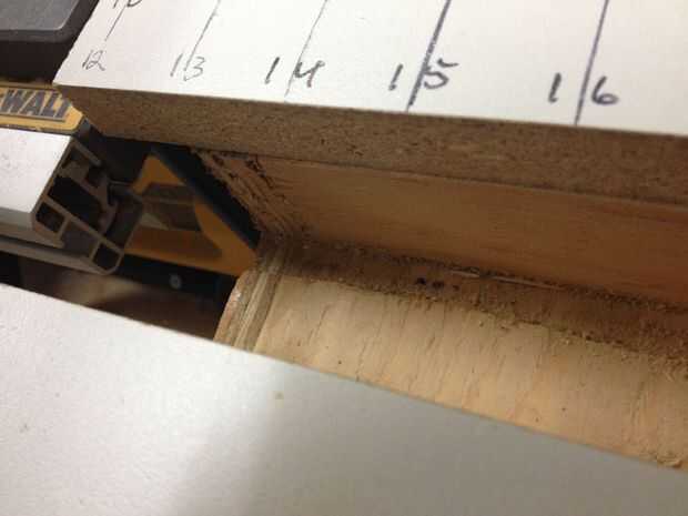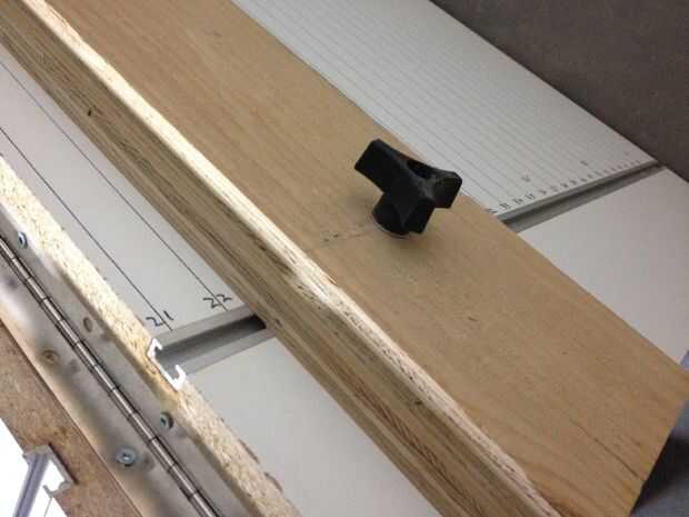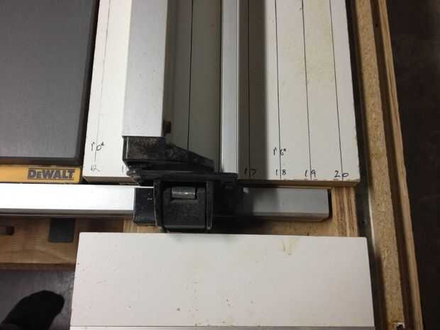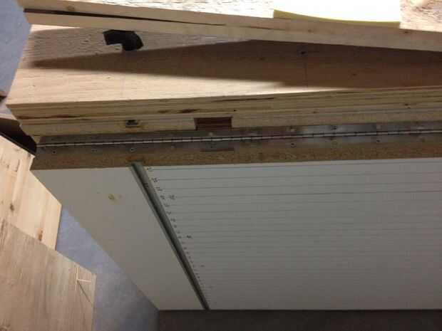 10) Instale a la guía de canales metálicos para el tope-guía auxiliar. La cerca se acaba de hacer dos piezas de madera contrachapada atado junto con cuatro agujeros perforados en ella para ajustar la posición de la parada con respecto a iniciar o terminar el corte. Si usted tiene un pedazo de plástico laminado; laminado al borde de 'deslizamiento' vertical de la valla (la parte que hace contacto con la pieza de trabajo).