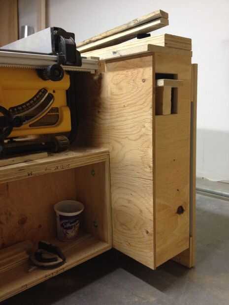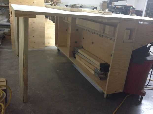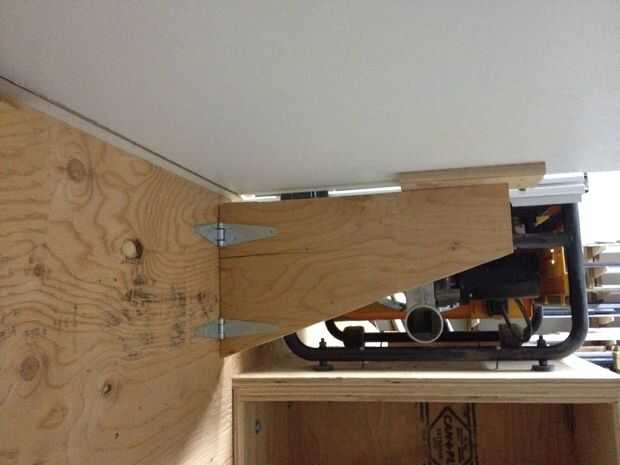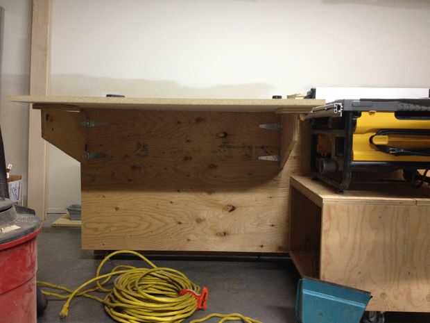 9) Instale el soporte de salida pequeño (3'3 "x 2') usando la otra bisagra de piano. Usted necesita utilizar otra pieza de bloqueo (no dimensionado en estos planes) unos 3' de largo para espaciar adecuadamente la parte superior y los brazos plegables (J, K) permitir doblar debajo de la parte superior. Adjuntar los brazos al lado de la pieza de madera contrachapada principal 'A' usando dos puerta bisagras cada uno; espaciar los brazos que soportan la derecha cerca del borde de la mesa de salida; Esto les permite cerrar sin interferir uno con el otro. Corte dos bloques de soporte se apoya debajo de la parte superior; Estos se abrirá la mesa a ras con la superficie adyacente.