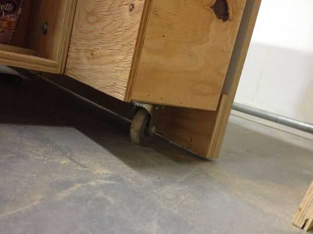 7) en este punto la estación de trabajo está haciendo pesado; así que gira a un lado y atornillar las tres ruedas en el lugar: uno en cada extremo de la parte larga y delgada: utilizar el centro real de la base como el marco es más pesado en el lado izquierdo (el lado con la tabla vio unido a él); y uno en el centro del Mesa soporte de la Sierra; como cerca del borde como sea posible. La otra esta rueda es; es más triangular de la base y más estable será la estación de trabajo.