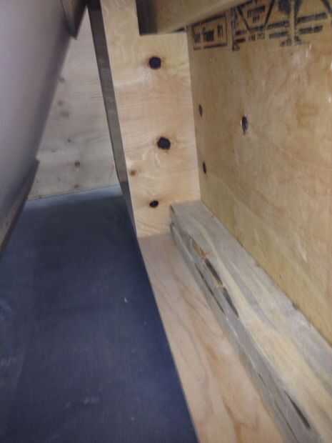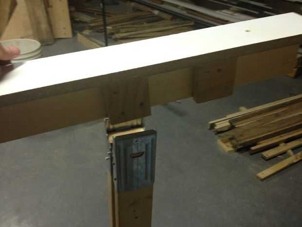 4) fijar piezas R y S a lo 2'6 "X 6' MDF, consulte la página 9 para esto. En el lado de las bisagras proporciona apoyo adicional para la bisagra del piano, mientras que uno en el borde externo proporciona soporte estructural y un lugar para las piernas sujetar a. Mis piernas tienen 3/4" agujeros profundos, poco más de 1/2" de diámetro, perforado a través de la madera contrachapada. Yo luego un pasador de 3" en (tan sólo 3/4" fue expuesto) a la parte superior de un 2 x 4 y esto es todos los que utilizo para las dos piernas.