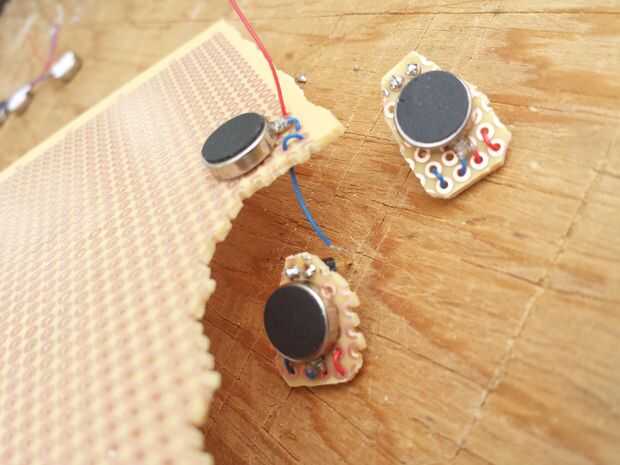VIB motores - conduce en el buscapersonas es pequeñito y fácil de romper. Alivio del estrés es esencial. Coloque el motor de remonte en el lado de cobre dejando suficiente espacio libre (soldadura tocando el caso motor es prob malas noticias) en el lado opuesto a donde salen los cables para dos pastillas. En este caso que los conductores fueron tejidos en el tablero de perf un par de veces luego ante los mismos orificios de dos patillas de cabecera saliente en el lado opuesto de la tabla que el motor está pegado a soldadas en su lugar. Puede fijarse a la tela utilizando palo de Velcro (ganchos) en el lado de la cabecera en blanco.
