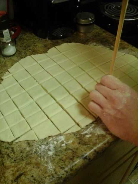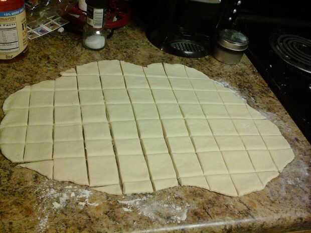 Después saca la masa, cortar las piezas sobre una pulgada cuadrada. El resto de la masa puede laminado y corte otra vez o izquierda extrañamente tamaño.