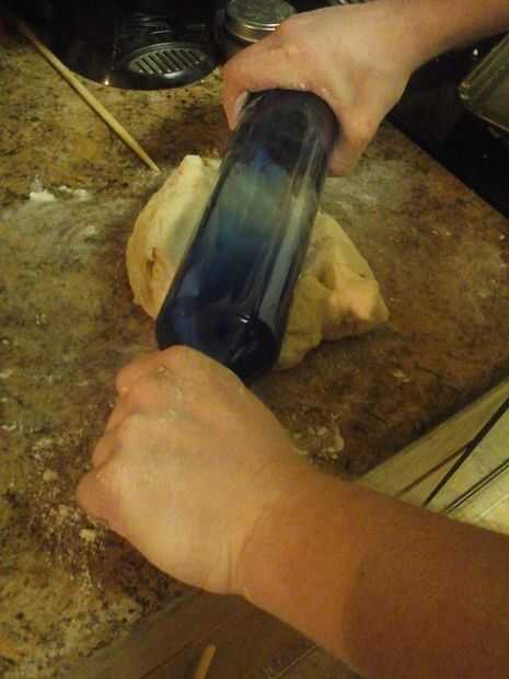 Generalmente solo utilizo mi rodillo mármol para esto, pero pensé que podría probar un método diferente. Limpié una gran botella de vino y llenó de agua para este proyecto. El peso fue un buen poco menos, pero era capaz de conseguir el resultado deseado. Si usted no posee un perno de balanceo, esto podría ser una solución de bricolaje que usted puede intentar.