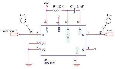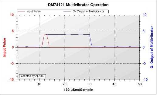 En este experimento demostrativo que el ATE es operada en modo de ráfaga, un pulso de 0-4V es alimentado a la entrada B del 74121 de Vout3 y la salida Q observado en Ain2. La salida Q va alto cuando provocada por la entrada B y se mantiene alto durante un período de 2000uSec contra un valor calculado 0,7 * R1C1 = 1680uSec.
