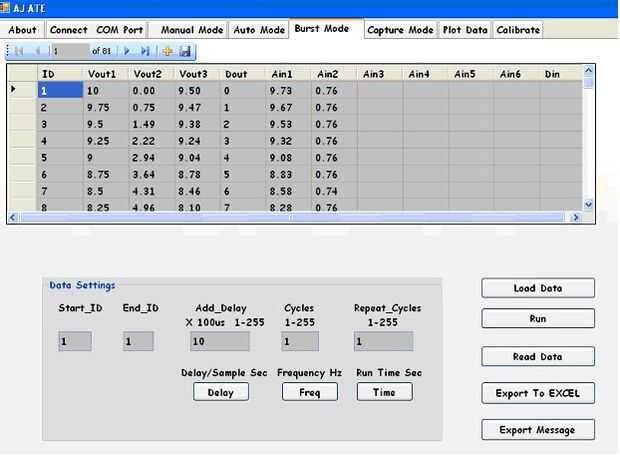 El modo ráfaga supera el proceso relativamente lento de I/O serial entre la PC del anfitrión y ATE-unidad que se utiliza en los modos Auto y Manual. En el modo ráfaga, una secuencia de valores correspondientes a Vout3 primero es transferida para el microcontrolador. Un comando ejecutar salidas estos valores a un ritmo mucho más rápido y adquiere los valores correspondientes de la Ain1 Ain2 en la memoria. Los datos adquiridos se transfieren nuevamente a la PC usando el comando de lectura.