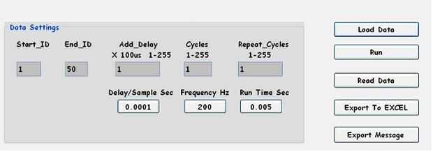 Iniciar las tareas de 'Run' el microcontrolador a los valores de Vout3 de salida en secuencia a intervalos 100µsec y almacenar los valores adquiridos de Ain1 & Ain2 en él es la memoria interna. El botón 'Ejecutar' (pantalla 5) indica ocupado durante este período y el indicador de 'Ocupado' parpadea en la unidad ATE.