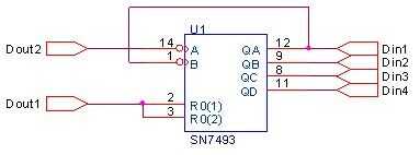 R0 (1) & R0 (2) conectado a Dout1, se mantiene alta (Reset del contador) y dos pulsos negativo que va se alimentan en Dout2. Dout1 entonces se establece en bajo (cuenta) y se alimenta una serie de pulsos negativo que va en el Dout2. Din1 que se observa la salida de 4 bits. (Pantalla 2).