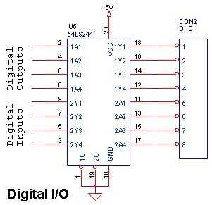 Un Buffer Octal 54LS244, U5 se utiliza para amortiguar las entradas digitales y salidas hacia y desde el microcontrolador. Esto proporciona amortiguación y protección a los pins de I/O del microcontrolador.