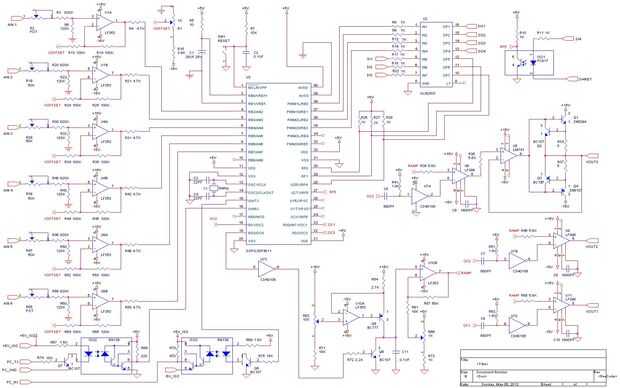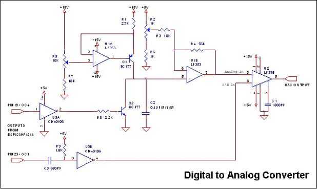 Un Microchip DSPIC30F4011 funciona a una frecuencia de 96 MHz de reloj y las señales PWM de captura se establecen para una cuenta de 1200 corresponde a una frecuencia PWM de 20 KHz. Señal PWM OC4 con un número fijo de 1170 se utiliza como referencia para la generación de rampa y OC1 controla el DAC PWM. U1A IC junto con el transistor PNP Q1 forma una fuente de corriente de precisión de carga del condensador C2. OC4 había invertida por IC U3A interruptores en NPN transistor Q2 por un período de 30 cuentas generando una rampa nominal 0-5V en el condensador C2. La rampa es tamponada por IC U1B y amplificada, la ganancia y offset se ajustan por los potenciómetros R5 y R2. Señal PWM OC1 diferenciados por condensador C3 y el resistor R9 es invertida por IC U3B formando una señal de muestra 1uSec para el U2 de IC de muestreo y retención. U2 Pin 5, forma la salida DAC y se ajusta a - 10V, 0V y + 10V para cuentas OC1 PWM de 88, 600 y 1112 respectivamente, correspondiente a una cuenta de 10 Bit de 1024.