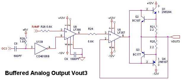 El 9:50 rampa V forma la entrada de señal a un S/h. IC LF398, U9. La salida del U9 es la-buffered señal analógica correspondiente a Vout3.
