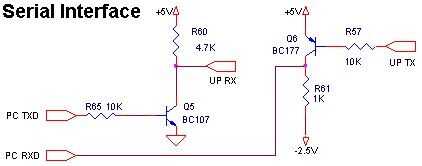 Una simple interfaz se basa en la disponibilidad de + 5V y - 2.5V proporciona. Q5 forma un inversor y convertidor de nivel de TTL para el PC TX datos y Q6 toma el microcontrolador TTL TX datos y convierte en pseudo RS232 niveles de - 2, 5V a + 5V adecuado para los datos de RX del PC.
