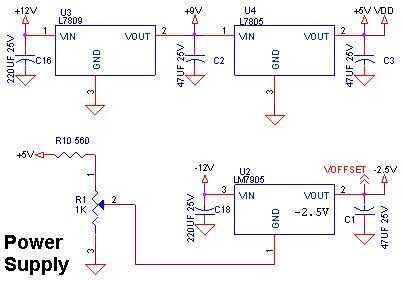 R1 se ajusta la tensión de contacto 1 de U2 que es alimentado por - 12V para proporcionar un - 2.5V offset voltaje para las etapas de entrada analógicas.