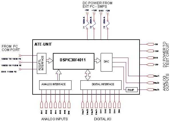Un 'Microchip' DSPIC30F4011 microcontrolador que interfaces de la entrada-salida de Analógico/Digital y está conectado a un PC a través de una interfaz serial forma el corazón del sistema ATE. Las operaciones de microcontrolador se manda a través del enlace serial en el PC Host utilizando el software dedicado de ATE.