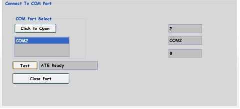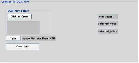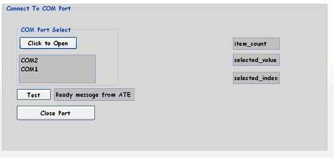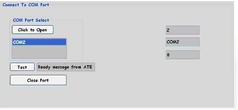 Seleccione el puerto COM al que se ha conectado la unidad ATE: valor seleccionado muestra COM2 y otros diagnósticos muestran que hubo 2 puertos disponibles y se ha seleccionado el puerto con índice 0. (Pantalla 3)