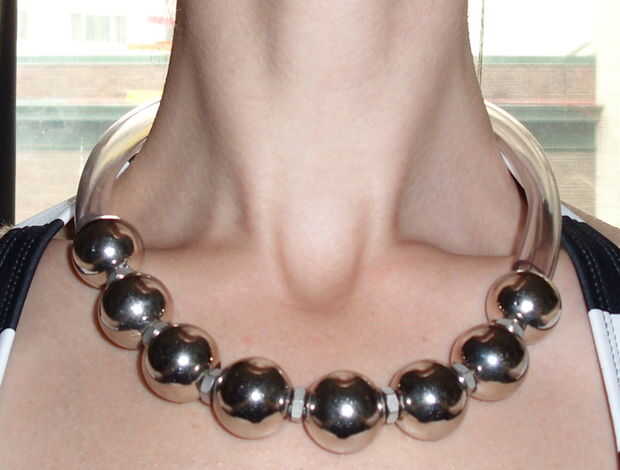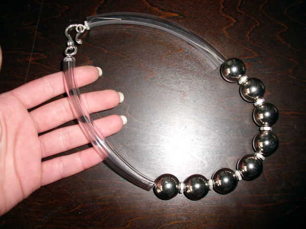 En cualquier caso, finalmente encontró un lugar con algunas tuercas y granos de metal tono plata plateado. Los granos grandes que encontré para super barato en una tienda de artesanía. Ellos son de plástico por debajo muy ligero y estoy seguro de obtendrá un montón de desgaste! Costo total fue de $15, incluyendo el cierre de s tono plata grueso, algunos doblar alambre y tubos de presión esterlina.