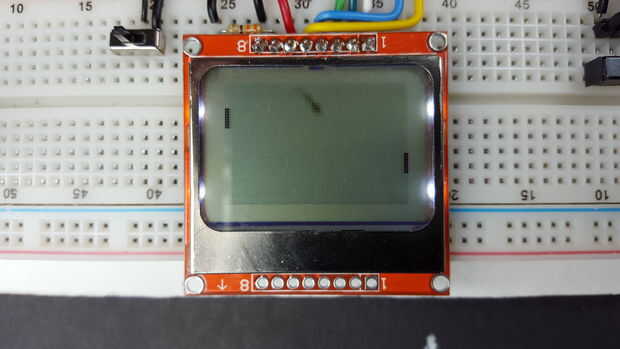 // Arduino Pong by Hari Wiguna, 2016// v0.0 - draw ball // v0.1 - move ball // v0.2 - using millis(), move in Y direction too // v0.3 - Paddles! #include "U8glib.h" //== Preferences == U8GLIB_PCD8544 u8g(13, 11, 9, 8, 10); // SPI Com: SCK = 13, MOSI = 11, CS = 9, A0/DataCommand = 8, Reset = 10 // Analog pins where we connect the potentiometers to int paddle0Pin = A1; int paddle1Pin = A0; //== Game Variables == u8g_uint_t courtWidth, courtHeight; u8g_uint_t ballSize = 4; u8g_uint_t ballX; u8g_uint_t ballDirectionX = 1; u8g_uint_t ballY; u8g_uint_t ballDirectionY = 1; u8g_uint_t paddleWidth = 2; u8g_uint_t paddleHeight = 8; unsigned long timeToMove; int animationSpeed = 20; void MoveBall() { if (millis() > timeToMove) { ballX += ballDirectionX; if (ballX >= (courtWidth - ballSize) || ballX <= 0)ballDirectionX = -ballDirectionX; ballY += ballDirectionY; if (ballY >= (courtHeight - ballSize) || ballY <= 0) ballDirectionY = -ballDirectionY; timeToMove = millis() + animationSpeed; } } void DrawPaddle(u8g_uint_t paddleX, int paddlePin) { int analogValue = analogRead(paddlePin); // returns 0 through 1023 // Convert analogValue ranging from 0..1023 to paddleY ranging from 0..(courtHeight-paddleHeight) u8g_uint_t paddleY = map(analogValue, 0,1023, 0,courtHeight-paddleHeight); // Draw the paddle u8g.drawBox(paddleX, paddleY, paddleWidth, paddleHeight); } void DrawPaddles() { DrawPaddle(0, paddle0Pin); DrawPaddle(courtWidth - paddleWidth, paddle1Pin); } void setup(void) { u8g.setRot180(); // flip screen courtWidth = u8g.getWidth(); courtHeight = u8g.getHeight(); } void loop(void) { u8g.firstPage(); do { MoveBall(); u8g.drawBox(ballX, ballY, ballSize, ballSize); DrawPaddles(); } while ( u8g.nextPage() ); }