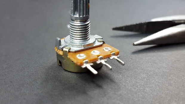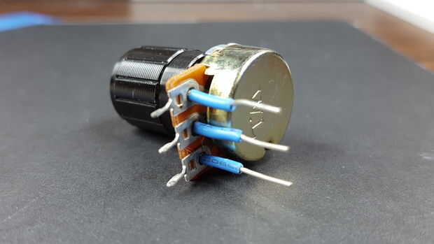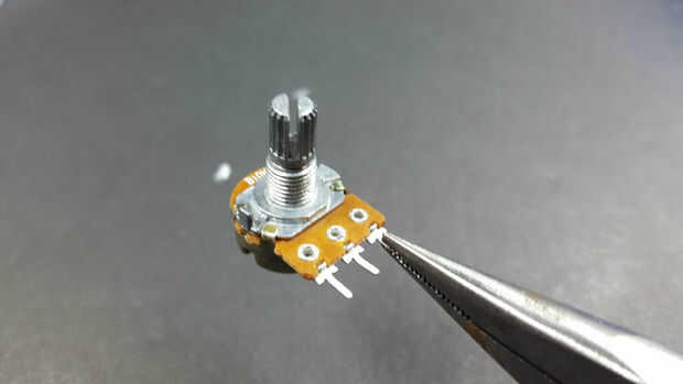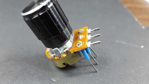 Prefiero tener el mando hacia arriba, por lo que soldar unos cables en el potenciómetro. Si usted hace esto, asegúrese de utilizar cables aislados porque el cuerpo del potenciómetro es de metal y fácilmente podría cortocircuitar las puntas.