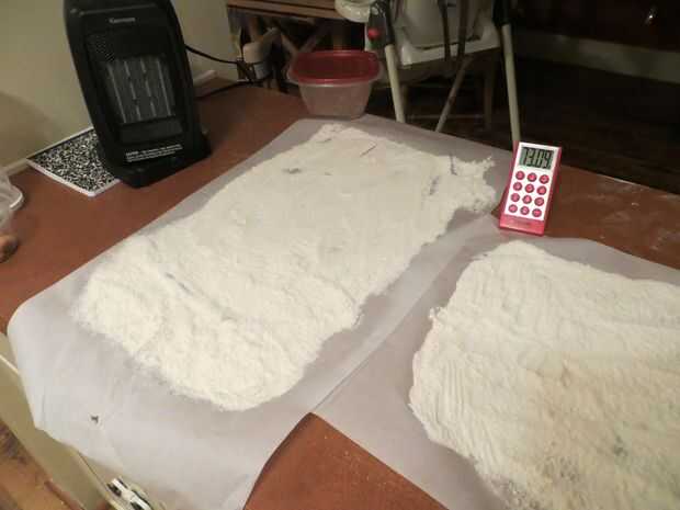 Establecidos de 90 minutos con calentador de espacio del pequeño (O menor calor en horno o deshidratador, o con cuidado en el fuego) [El último proceso pretende disminuir el nivel de humedad para prolongar la vida útil, y hay un número de maneras de lograrlo. Utilizar su método preferido aquí]