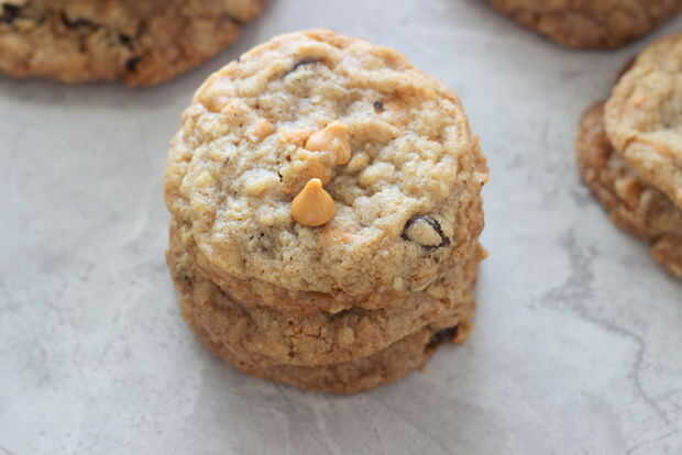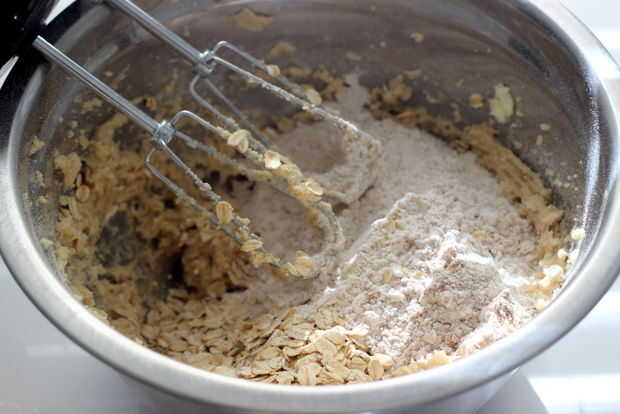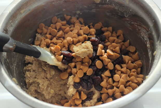 Añadir la avena y la harina a la masa en pequeñas cantidades, mezclando hasta que toda la harina y la avena es en la mezcla. Doble pasas y virutas de caramelo de mantequilla en la mezcla. Línea una placa para horno con papel sulfurizado y amontonamiento cucharadas de masa en la bandeja para hornear.