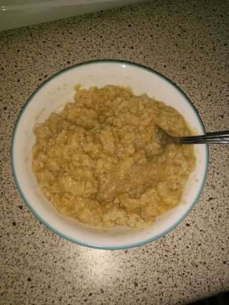 Después rigurosamente han mezclado la harina de avena, la frialdad de la compota de manzana debe han enfriado hasta una temperatura casi tolerable, pero puedes dejarlo reposar un minuto o menos para dejar la avena empaparse tanto de la compota de manzana como sea posible... No creo que tengo que explicar qué hacer, te diré que puedes agarrar una cuchara... ¡ Disfrute!