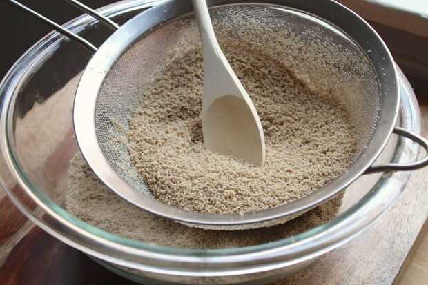Una vez las semillas han sido procesadas, verter parte de la harina en un colador y presione ellos a través de con las manos o con un tamiz de madera. La harina caerá a través y las brocas más grandes de la semilla se quedará en el tamiz para obtener procesado otra vez.