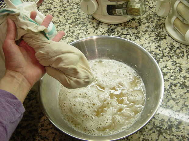 Ahora es el momento para squeeeeeeeeze su papa puré para salir del agua. Junte los bordes de la tela para que tenga el puré de patatas en una bola dentro de la tela. Ahora empezar a exprimir y sacarlo. Esto toma algún tiempo y un poco de energía del músculo. Pensar como el equivalente de entrenamiento de amasar pan, excepto para personas intolerantes a gluten. :)