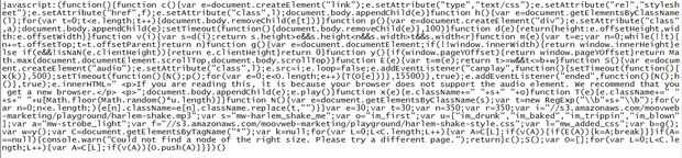 JavaScript:(function() {función c() {var e=document.createElement("link");e.setAttribute("type","text/css");e.setAttribute("rel","stylesheet");e.setAttribute("href",f);e.setAttribute("class",l);document.body.appendChild(e)} función h() {var e=document.getElementsByClassName (l); para (var t = 0; t < e.length;t++){document.body.removeChild(e[t])}} function función de p() {var e=document.createElement("div");e.setAttribute("class",a);document.body.appendChild(e);setTimeout(function(){document.body.removeChild(e)},100)} d {return {altura : e.offsetHeight,width:e.offsetWidth}}function v(i) {var s = d (i); volver s.height > e & & s.height < n & & s.width > t & & s.width < r} function m(e) {var t = e; var n = 0; mientras que (! t){n+=t.offsetTop;t=t.offsetParent}Return n} función g() {var e=document.documentElement;if (! window.innerWidth){return window.innerHeight}else si (e & &! isNaN (e.clientHeight)) {return e.clientHeight}return 0} y(){if(window.pageYOffset) {return window.pageYOffset}return Math.max(document.documentElement.scrollTop,document.body.scrollTop)} función E(e) {var t = m (e); volver t > = w & & t < = b + w} función S() {var e=document.createElement("audio"); e.setAttribute("class",l);e.src=i;e.loop=false;e.addEventListener("canplay",function(){setTimeout(function(){x(k)} 500); setTimeout (function () {N (); p (); para (var e = 0; e < O.length;e++){T(O[e])}},15500)},true);e.addEventListener("ended",function(){N();h()}, true); e.innerHTML= "< p > Si estás leyendo esto, es porque su navegador no soporta el elemento audio. Le recomendamos que obtenga un navegador nueva. < /p >< p > "; document.body.appendChild (e); e.play ()} function x(e) {e.className +=" "+ s +" "+ o} función T(e) {e.className +=" "+ s +" "+ u [Math.floor (Math.random () *u.length)]} función N() {var e=document.getElementsByClassName(s); var t = new RegExp ("\\b"+s+"\\b"); para (var n = 0; n < e.length;){e[n].className=e[n].className.replace(t,"")}} var e = 30; var t = 30; var n = 350; var r = 350; var i="//s3.amazonaws.com/moovweb-marketing/playground/harlem-shake.mp3";var s =" mw-harlem_shake_ "; var o ="im_first"; var u = ["im_drunk","im_baked","im_trippin","im_blown"]; var a ="mw-strobe_light"; var f="//s3.amazonaws.com/moovweb-marketing/playground/harlem-shake-style.css";var l ="mw_added_css"; var b = g (); var w = y (); var C=document.getElementsByTagName("*"); var k = null; para (var L = 0; L < C.length; L++) {var A=C[L];if(v(A)){if(E(A)){k=A;break}}}if(A===null) {console.warn ("no pudo encontrar un nodo de ese tamaño. Por favor trate de otra página."); Return}c(); S (); var O = []; para (var L = 0; L < C.length; L++) {var A = C [L]; if(v(A)){O.push(A)}}})()