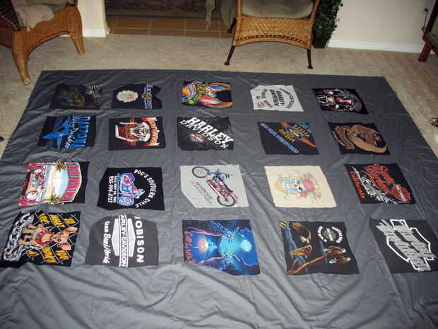 Coloque el respaldo en posición boca abajo. Si es una hoja hace las costuras hacia arriba. Si es una tela impresa, orientar la impresión hacia el suelo. Trazado de sus plazas de camiseta en el respaldo, cuatro a través y cinco a lo largo de la hoja, ver foto. Desea los ponen en el respaldo para que pueda ver cómo juegan hacia fuera. Entonces comienza moviéndote hasta encontrar una configuración que sea agradable a usted. Quiero romper como los colores, los colores reales con los no tan coloridos, etc.. Jugar con ellos; usted sabrá cuando es adecuado para usted.