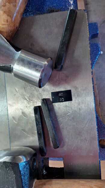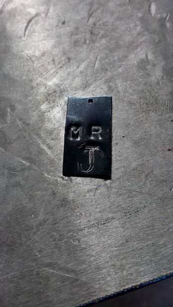 Usando dos diferentes tamaño de sellos de acero, martilló el nombre "Sr. J".