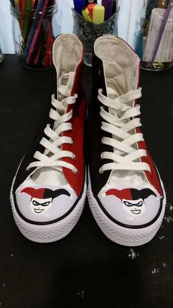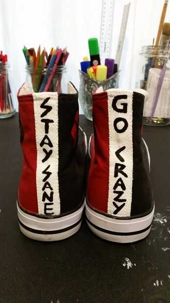 cómo hacer Harley Quinn botasLo que usted necesita1. rojo o negro botines, lo encuentras en eBay.2. roja o negra pintura en aerosol3. pato cinta¡Cómo!1. justo lo que he hecho es tengo botines rojos, por lo que he pato cinta las piezas del zapato que