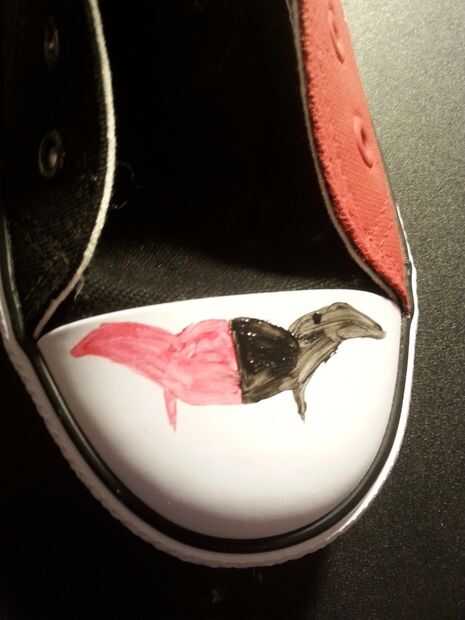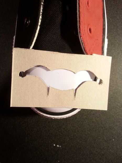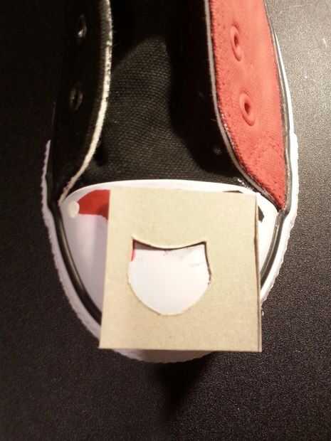 Cuidadosamente coloque la plantilla del sombrero en la parte delantera del zapato y mantener en su lugar mientras la pintura uno negro y uno rojo, marqué el centro de la plantilla así que sabía dónde pintando. Quitar la plantilla suave de los bordes y aplicar unas cuantas capas más hasta que el blanco no se presenta a través de. Con pintura blanca, la pintura de los círculos pequeños en el extremo de los puntos del sombrero.