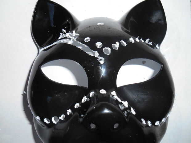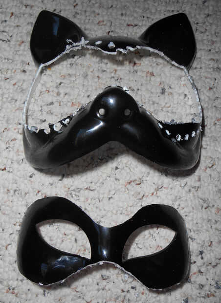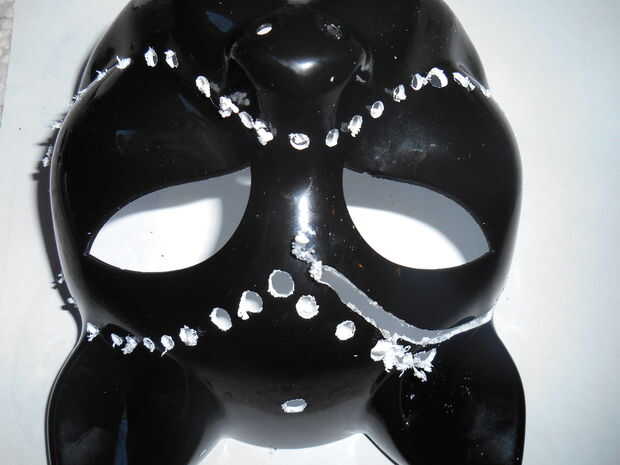 7. usando una herramienta Dremel (o similar), perfore los agujeros alrededor de los bordes outsie de aproximadamente 1/16" de las líneas de trazado en la máscara. 8. Use la broca de corte en la herramienta de Dremel (también puede usar una sierra pequeña o algo similar), comienzo del corte a lo largo de las líneas de trazado de la parte posterior de la máscara. Asegúrese de que usted mantenga la herramienta Dremel en un ángulo de 90 grados a la superficie que está trabajando, para que no bisel unidireccional o a otro (puede hacerlo más tarde si lo desea).
