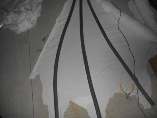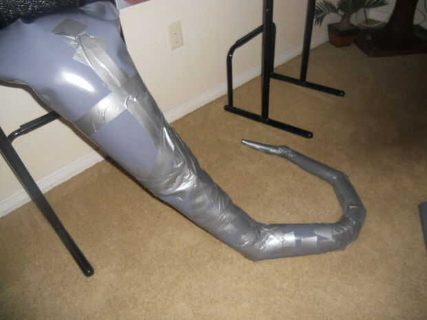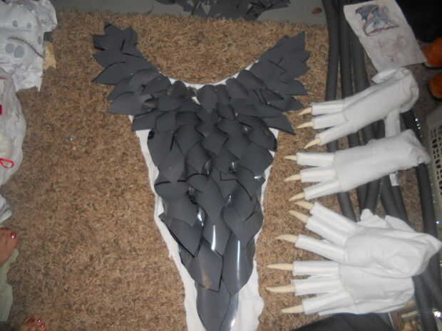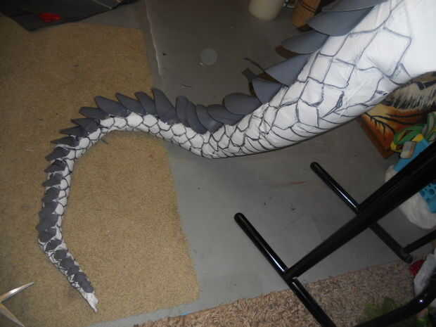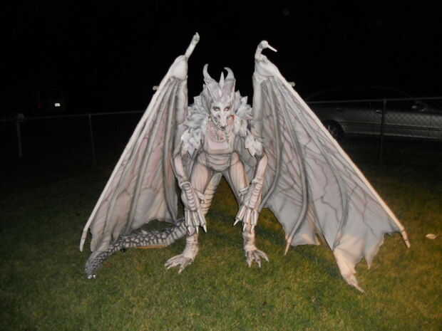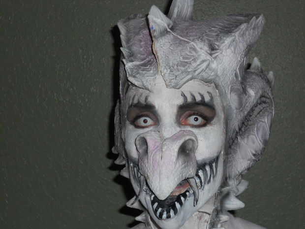 Tuve un poco de ayuda con la construcción de las alas de revestimiento de pvc y aire acondicionado. las alas son hojas blancas de un cliente mío. Se abre con una tuerca y un tornillo en la parte posterior del pvc. Compró un traje de cuerpo blanco de línea a aerógrafo y las manos y los pies con uñas esculpidas hechas de una madera del polvo mezclado con agua y una capa de acrílico de uñas blanco. También puse alambre a través de los dedos para doblar para arriba para que las uñas no chocar con el suelo al caminar. Me compré una máscara $70 que trocear y poner velcro ajuste. Pegué la nariz en latex entonces... la cola es de baño de línea y relleno... las escamas son revestimiento de baño y pegado en caliente. no olvidemos los contactos frescos que compré en línea... así que wala... justo lo que quería.